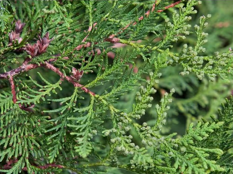 Foliage: The foliage consists of dense, scale-like needles in flat sprays that are dark green and fragrant when crushed.