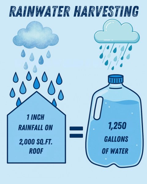 Rule of thumb: 1 inch of rain on 2,000 sq ft of roof ≈ 1,250 gallons of water.
